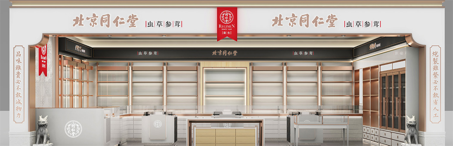 我們?cè)谶M(jìn)行設(shè)計(jì)時(shí)取舍繁雜的元素,協(xié)調(diào)色彩、使標(biāo)識(shí)簡(jiǎn)潔易懂。遵循清朝皇家建筑匾額和皇帝冠冕的形式設(shè)計(jì)布局,同仁堂的堂徽位列正中,在旗幟標(biāo)的襯托下更加醒目。兩側(cè)金字招牌清晰明了的說明了店鋪售賣的產(chǎn)品[參茸蟲草],能使人一目了然地了解店鋪的經(jīng)營(yíng)特色。立柱上書寫同仁堂人盡皆知的文化理念,體現(xiàn)同仁堂作為皇家御用的文化背書和傳承。