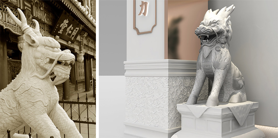 麒麟獻(xiàn)瑞石雕佇立兩側(cè),既是仁慈和祥的象征,又是同仁堂門店之前瑞獸,可以讓消費(fèi)者很輕松地與母品牌鏈接起來。