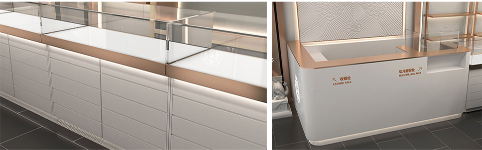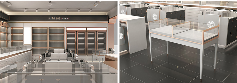 采用深灰、白和玫瑰金色搭配,使整體店面既有富麗堂皇之氣場(chǎng),也有清新脫俗之雅韻。一方面與同仁堂傳統(tǒng)店面形象區(qū)分開來,另一方面在傳承同仁堂文化的同時(shí)也對(duì)同仁堂形象進(jìn)行了升華,使其店面更具視覺特點(diǎn)和識(shí)別性;更加現(xiàn)代時(shí)尚,符合未來人群的審美情趣。