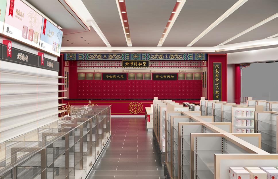 內(nèi)部設(shè)計(jì)相比外部設(shè)計(jì)而言,涉及的設(shè)計(jì)元素更多,難度也更大。涉及的元素包括通道、柜臺(tái)、色彩、燈光、音樂、商品陳列布局等。我們依據(jù)同仁堂的文化屬性,強(qiáng)化空間布局及持續(xù)改善功能,讓顧客停下腳步,體驗(yàn)、了解商品,實(shí)現(xiàn)產(chǎn)品動(dòng)銷,門店增量。