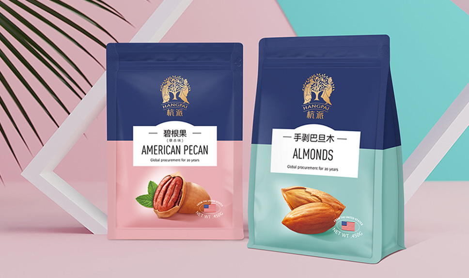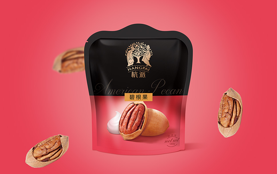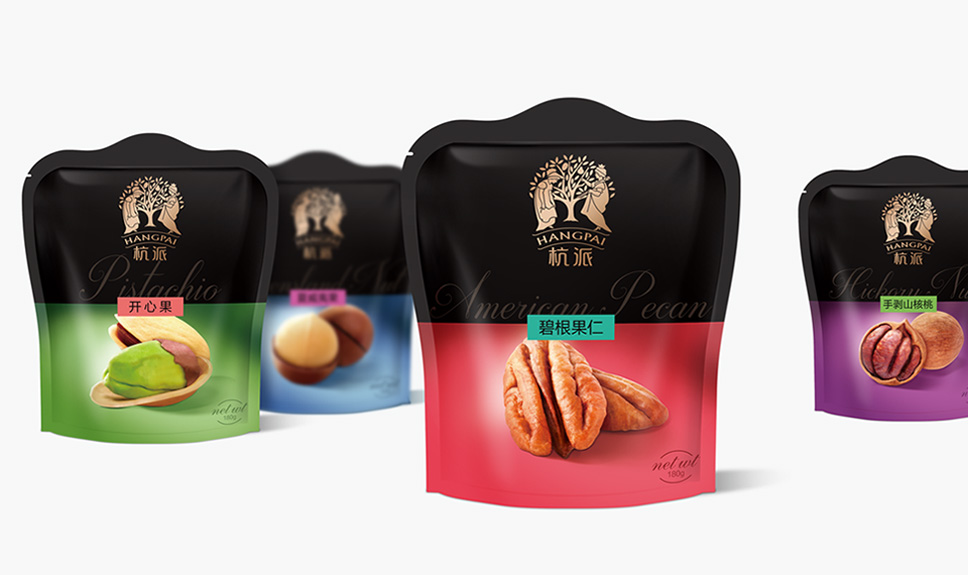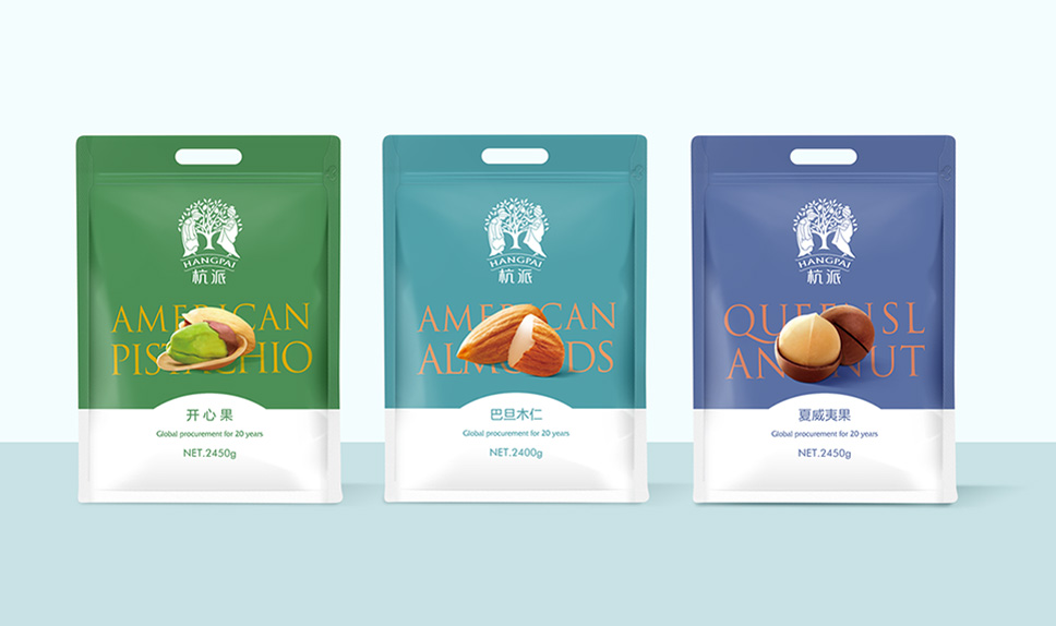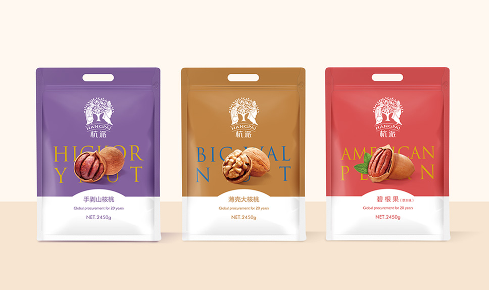 李華清項目團隊將書手抓包采用透明pe袋,能讓消費者直觀看到堅果實物,飽滿的堅果,甚至能透過包裝袋就能感受到香氣四溢出來,營造消費者心里的滿足感和食欲感,增加受眾對品質(zhì)的信任度。同時核心視覺元素延用杭派戰(zhàn)略資產(chǎn),達到包裝視覺聚焦的效果,在終端的不斷市場傳播中,形成杭派強有力的品牌資產(chǎn)。