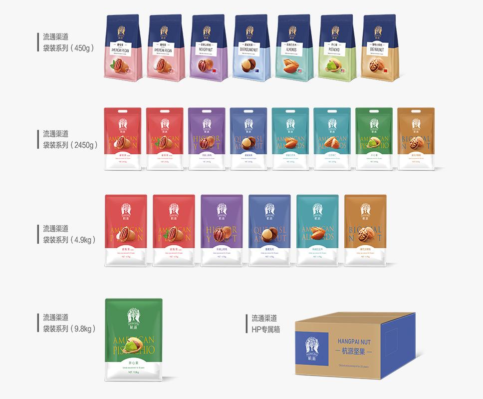 通過對現(xiàn)有堅果行業(yè)現(xiàn)狀、渠道、受眾人群、競品等分析產(chǎn)品包裝設計,李華清北京食品營銷策劃團隊整體規(guī)劃出杭派流通、KA渠道產(chǎn)品結(jié)構(gòu)及產(chǎn)品線,并對整體產(chǎn)品形 象進行規(guī)范化設計定位。全新的形象放大杭派的核心優(yōu)勢產(chǎn)品力,坐穩(wěn)流通渠道堅果品牌第一把交椅的同時,助力杭派品牌在KA零售市場全面突圍。
